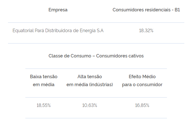 O efeito médio da alta tensão refere-se às classes A1 (>= 230 kV), A2 (de 88 a 138 kV), A3 (69 kV) e A4 (de 2,3 a 25 kV). Para a baixa tensão, a média engloba as classes B1 (Residencial e subclasse residencial baixa renda); B2 (Rural: subclasses, como agropecuária, cooperativa de eletrificação rural, indústria rural, serviço público de irrigação rural); B3 (Industrial, comercial, serviços e outras atividades, poder público, serviço público e consumo próprio); e B4 (Iluminação pública). >