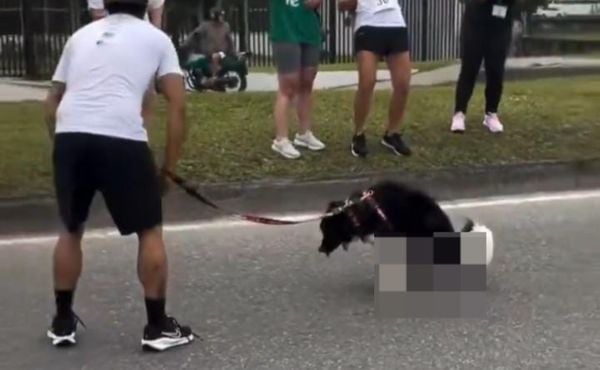 Cão faz pausa para fazer necessidades antes da linha de chegada