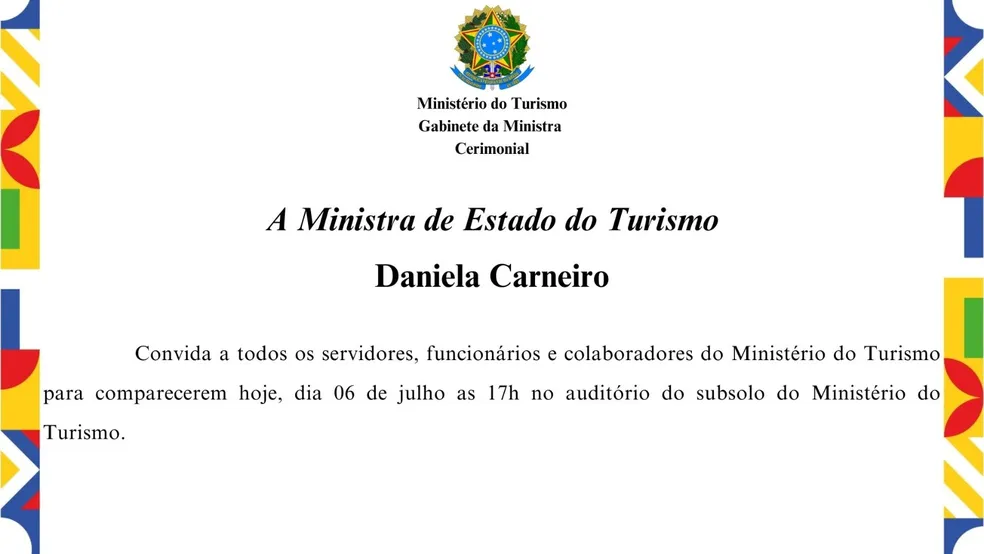 'A ministra de Estado do Turismo, Daniela Carneiro, convida a todos os servidores, funcionários e colaboradores do Ministério do Turismo para comparecerem hoje, dia 06 de julho às 17h no auditório do subsolo do Ministério do Turismo', diz o texto do convite divulgado.>