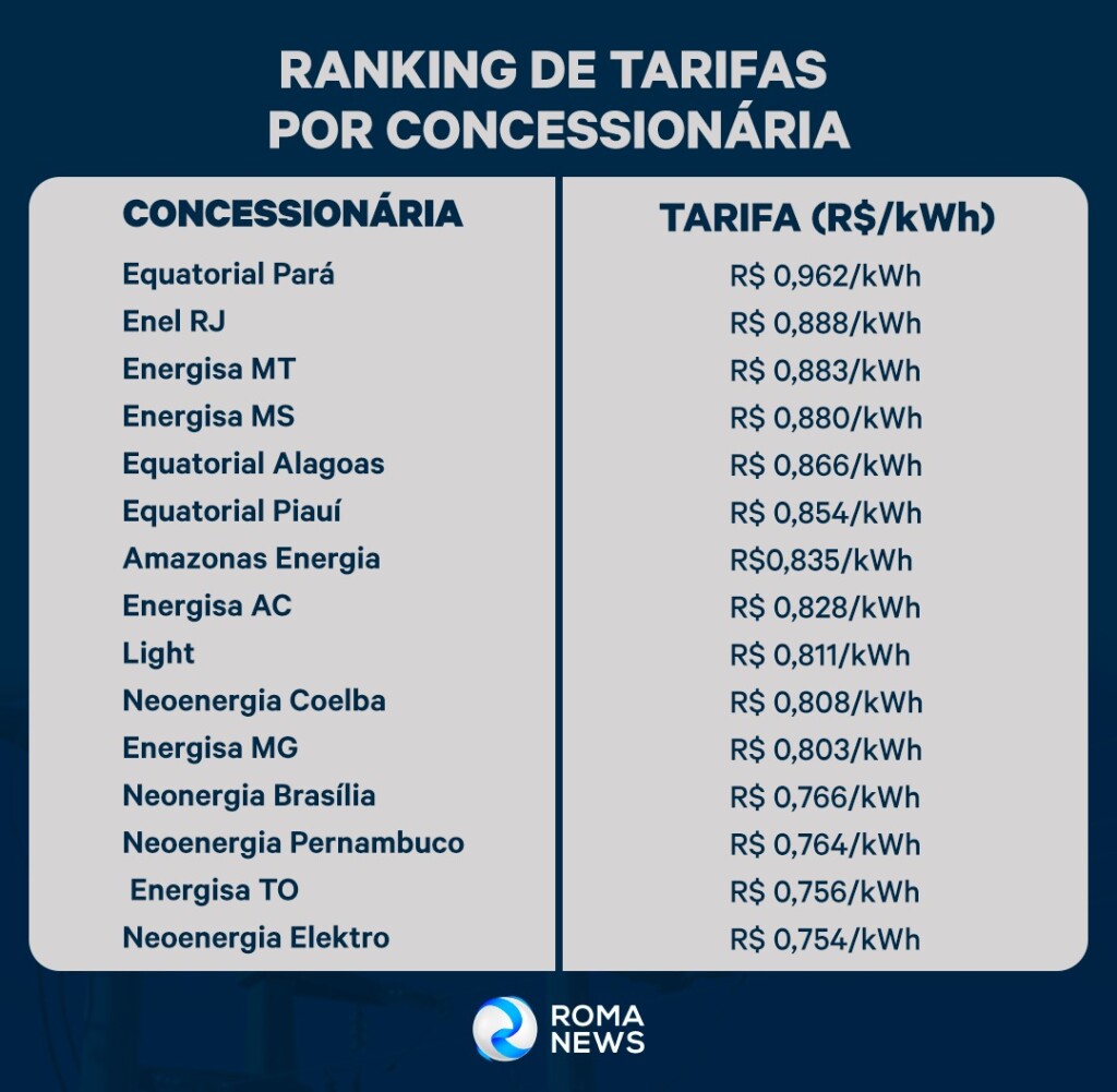 Já a concessionária com a tarifa mais baixa é a Companhia Campolarguense de Energia (Cocel), situado no município de Campo Largo, no Paraná. A cobrança pelo uso de energia elétrica nessa área de concessão é de R$ 0,589/kWh.>