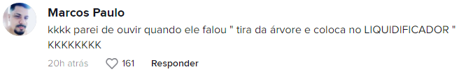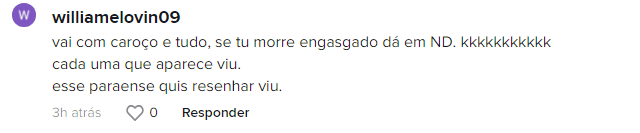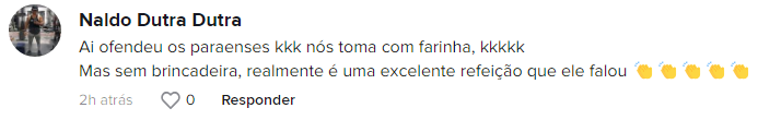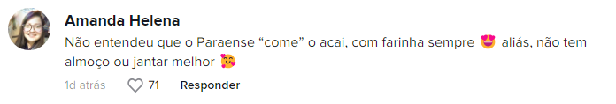 O vídeo publicado no TikTok rendeu vários comentários de paraense que não perdoaram o momento e brincaram com o nutricionista. O conteúdo publicado já possui mais de 9 mil curtidas e João é indagado se há problema em consumir açaí todos os dias para quem passa pelo processo de perda de peso. Ele responde falando que o consumo diário pode ser realizado sem problemas, mas seguindo as quantidades ideias conforme o plano alimenta.>
