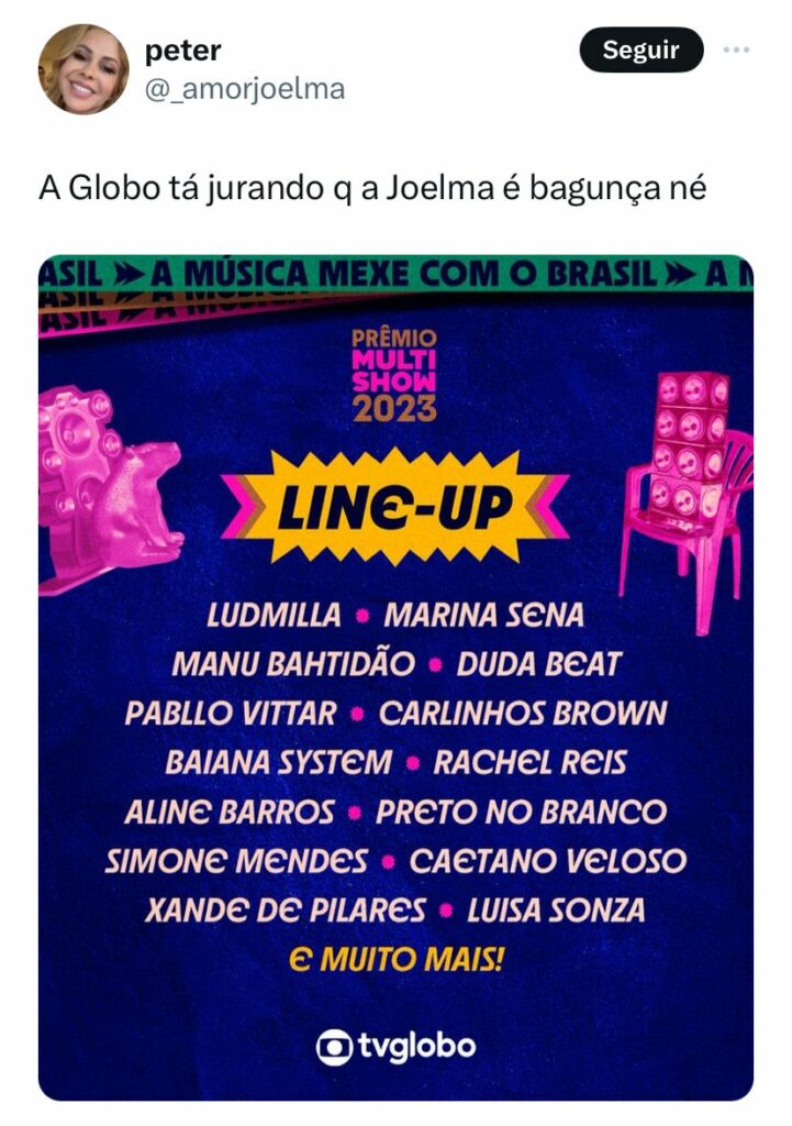 O Prêmio Multishow divulgou o line-up da festa, que ocorre na noite desta terça-feira, 07, e deixou alguns nomes de artistas de fora da lista, como o da cantora Joelma, causando revolta entre os fãs da paraense.>