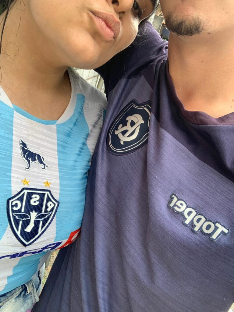 Ela destaca a persistência do namorado para conquistá-la. 'Quando eu deixava de falar com ele, uma das coisas que ele usava de argumento para vir atrás de mim era me encarnar, devido ao Paysandu e sempre foi assim.' >