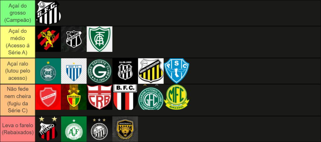 A tier list foi feita em consenso por Lucas Neves (jornalista esportivo), Paulo Bento (coordenador de redes sociais), Jorge Mateus (estagiário de produção) e Elias Felippe (estagiário de redes sociais).>